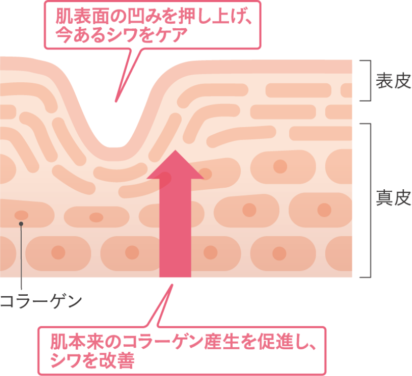 コラーゲンの産生を促進することで肌の凹みを押し上げる、シワ改善効果が承認された有効成分。