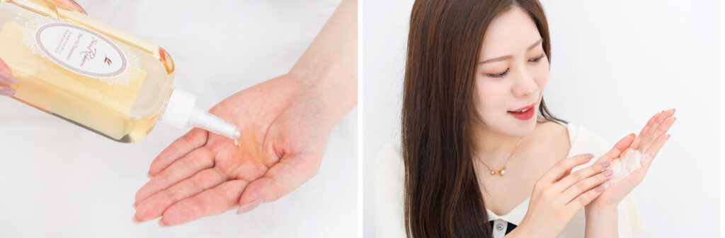 このオイル、出してくるくるするとクリームに変化するでしょう。