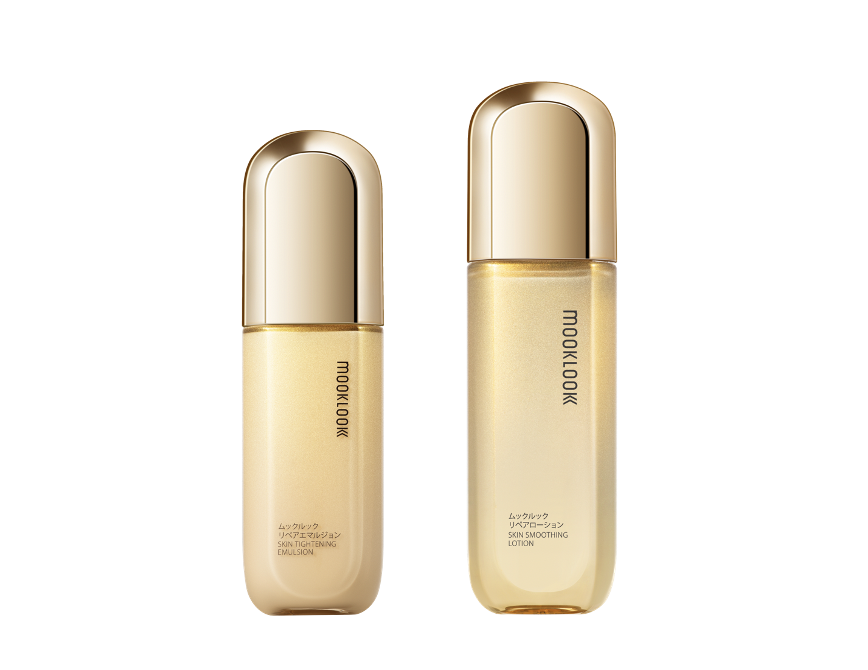 潤いと同時にツヤのある輝くような肌に導く化粧水「ムックルック リペアローション」に、ベタつかずにしっとりした乳液「ムックルック リペアエマルジョン」で肌を潤いベールで包み、透明感のある滑らかな肌へ。