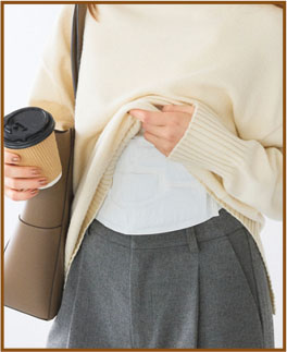 薄型で着膨れせず、40 ℃以上の温熱蒸気が6〜8時間持続。